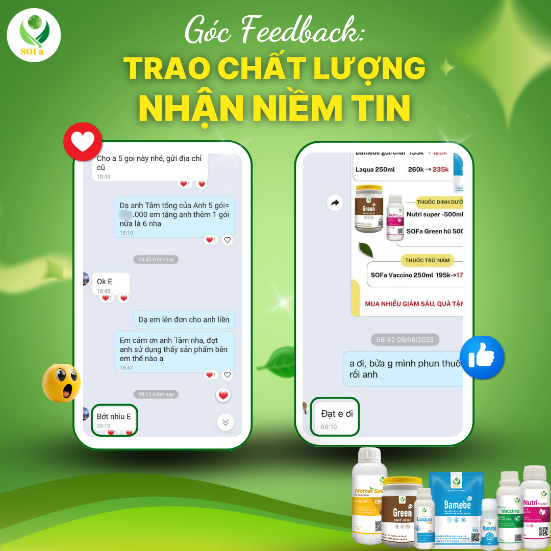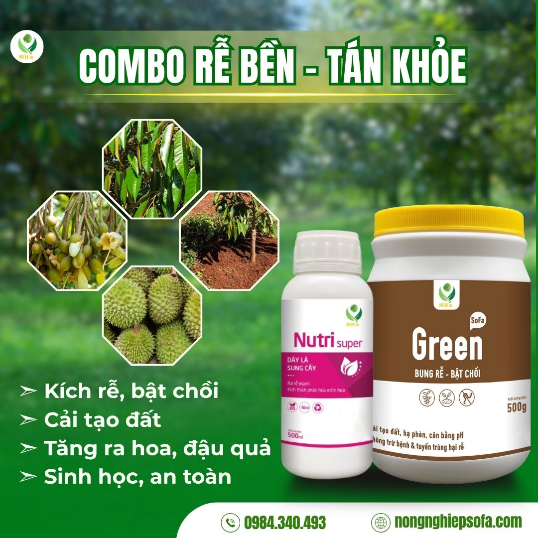 Combo Rễ Bền Tán Khỏe là bộ sản phẩm sinh học cao cấp từ Nông Nghiệp SOFa, gồm Green và Nutri Super. Bộ đôi này giúp kích rễ bật chồi, xanh lá khỏe cây, cải tạo đất phèn, đồng thời tăng ra hoa đậu quả hiệu quả. Giải pháp an toàn – bền vững cho mô hình nông nghiệp hữu cơ xanh sạch.